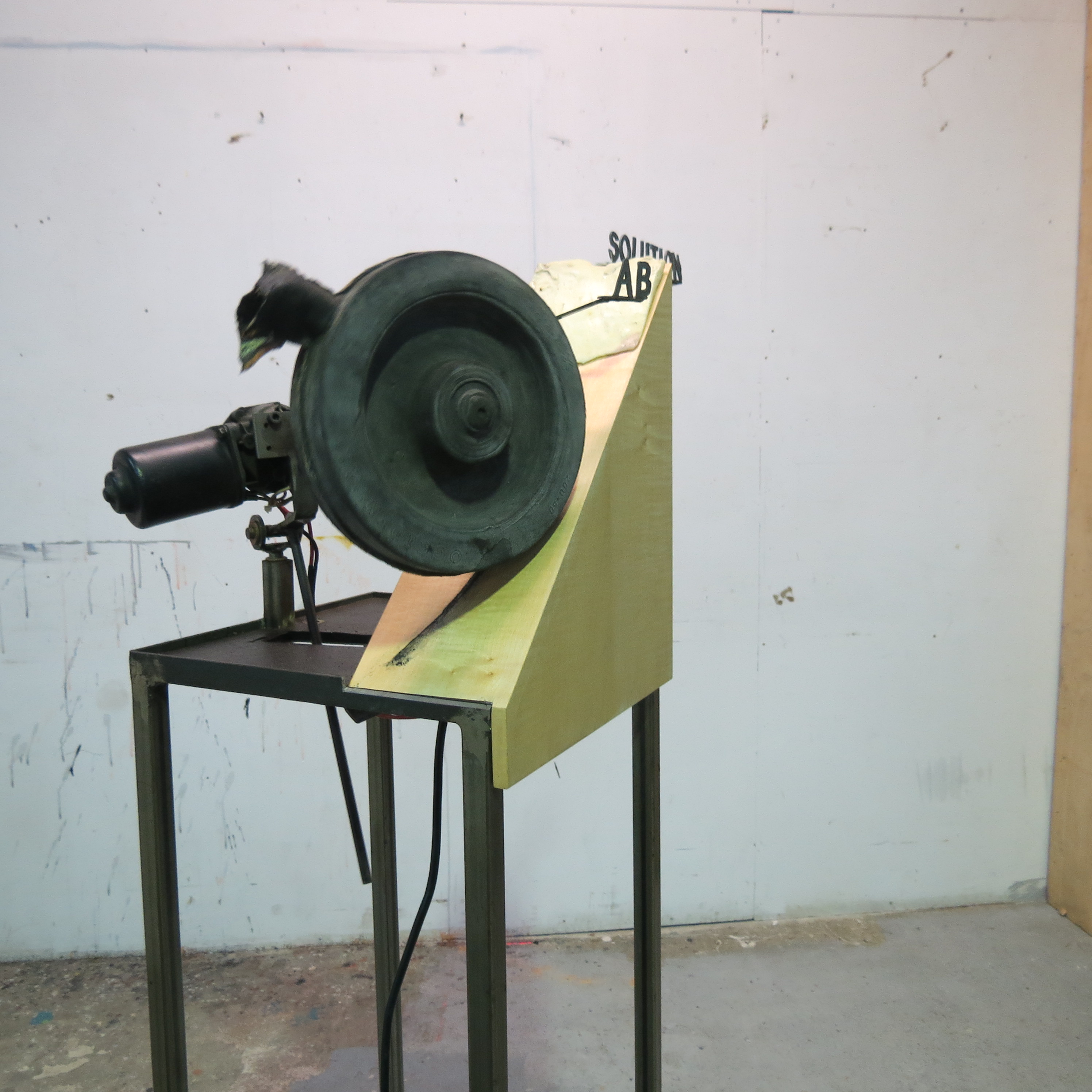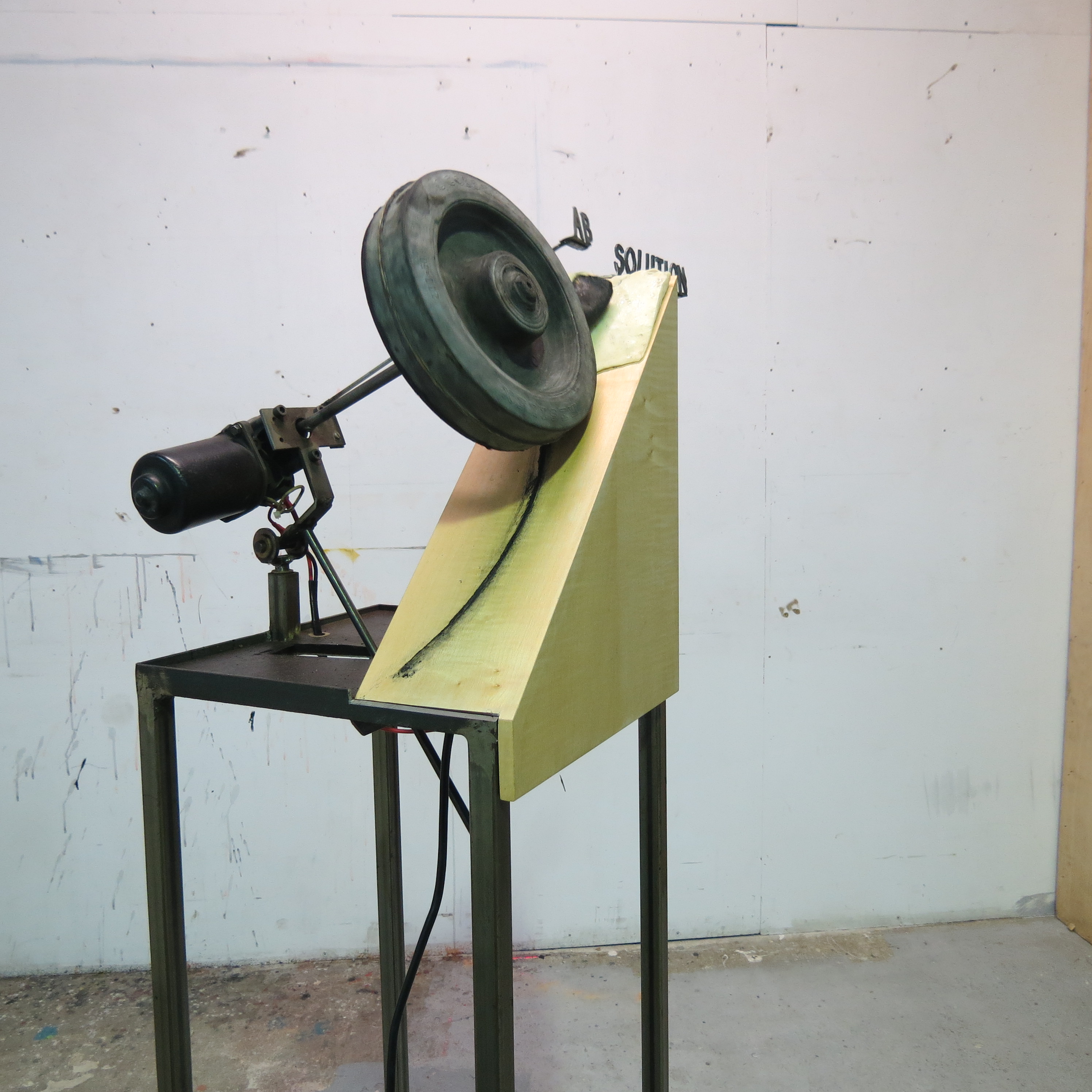 Sculpture acier mécano soudé, bois contreplaqué boulot, moteurs temporisations, goudron, savon, roue en latex. 125 cm x 35 x 35 cm . 1999