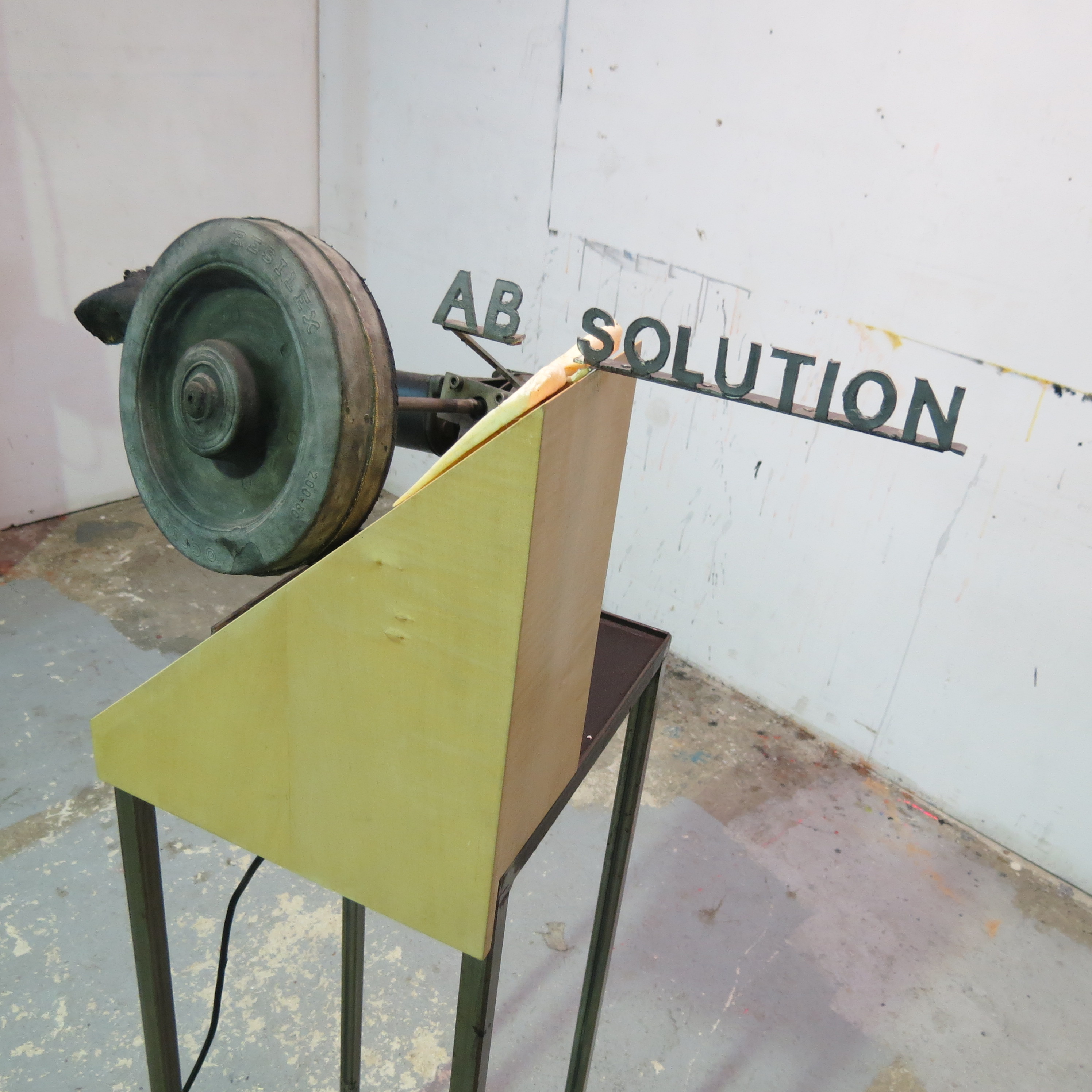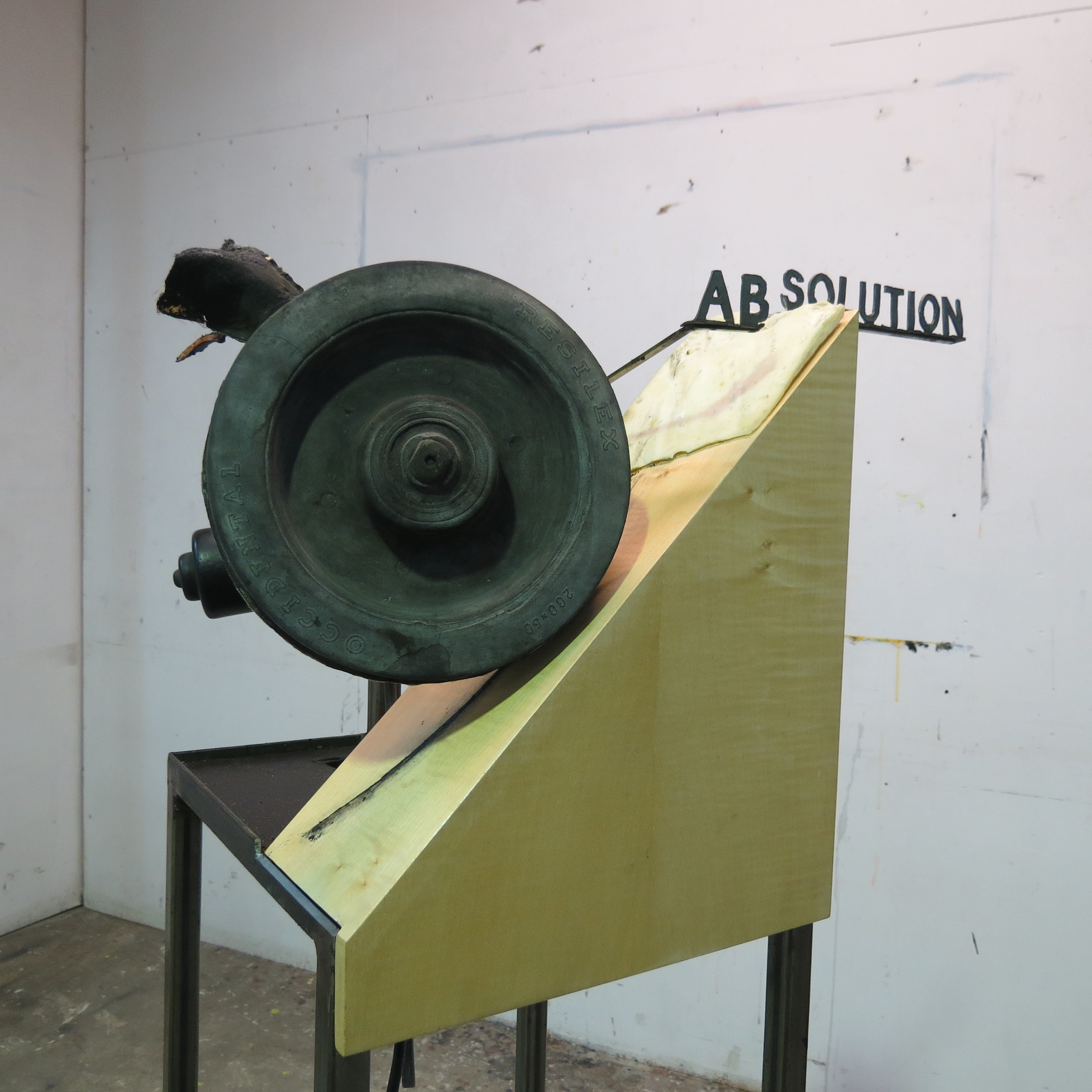Absolution : une roue en latex sur laquelle est accroché le préfixe AB tente de grimper une forme triangulaire en haut duquel est inscrit le mot : solution. Absolution se reconstitue un instant mais la roue glisse sur cette pente savonnée et redescend pour repartir dans une quête d’absolution sans cesse renouvelée.