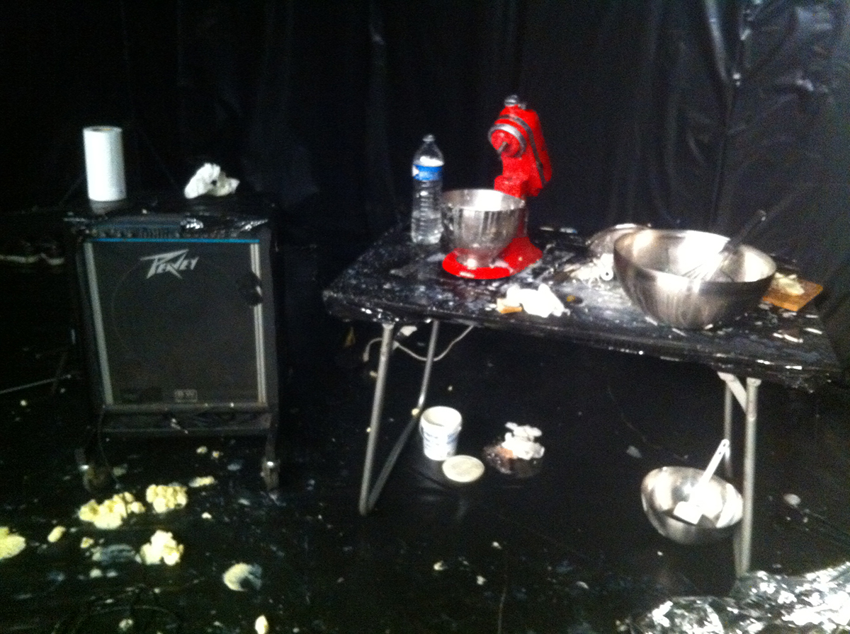 Dispositif : une table sonorisée sur laquelle est posé le matériel de cuisine ; le robot batteur est enfermé par une tour carrée de brique de beurre (250 gr) (11 X 6,5 X 3,5) soit 84 plaquettes