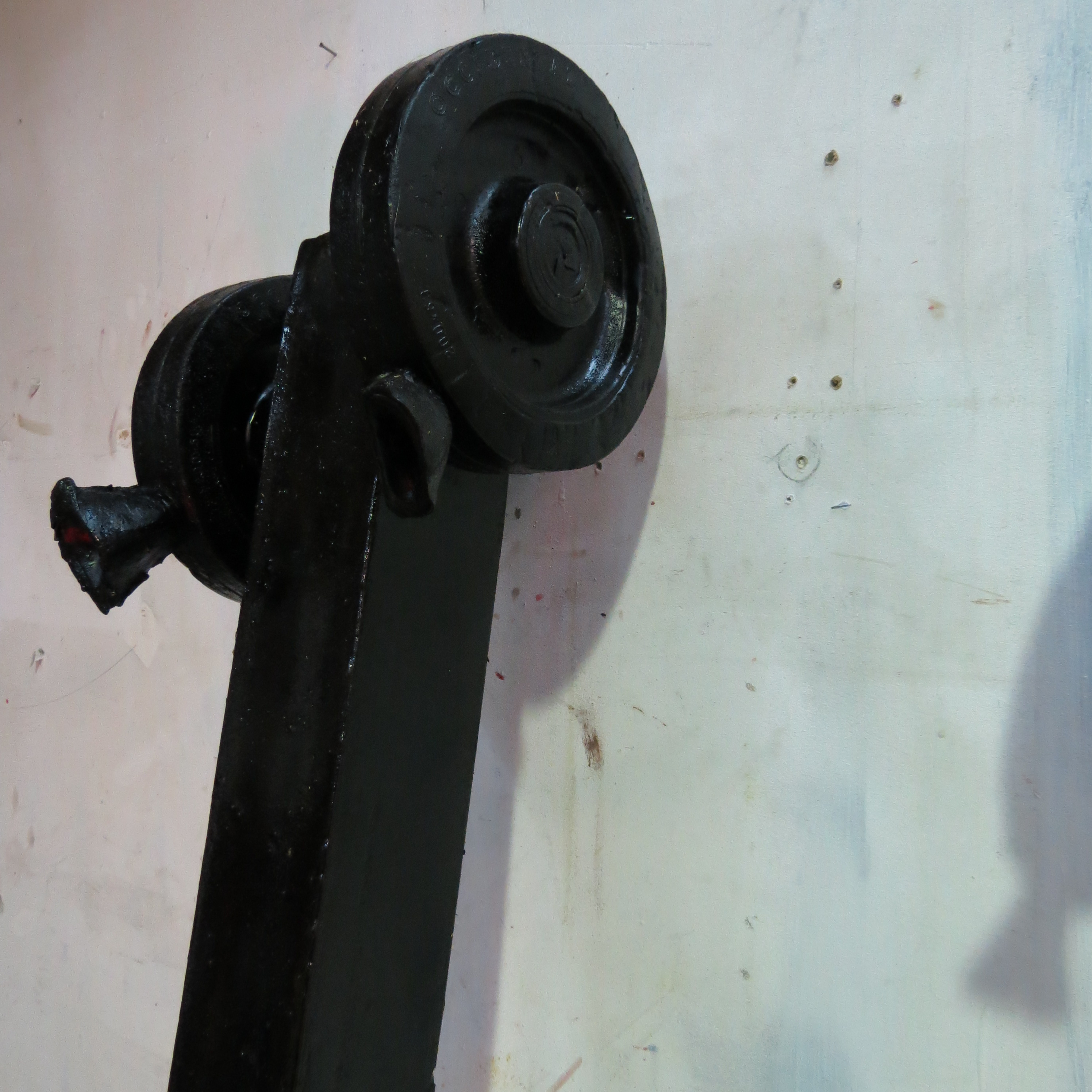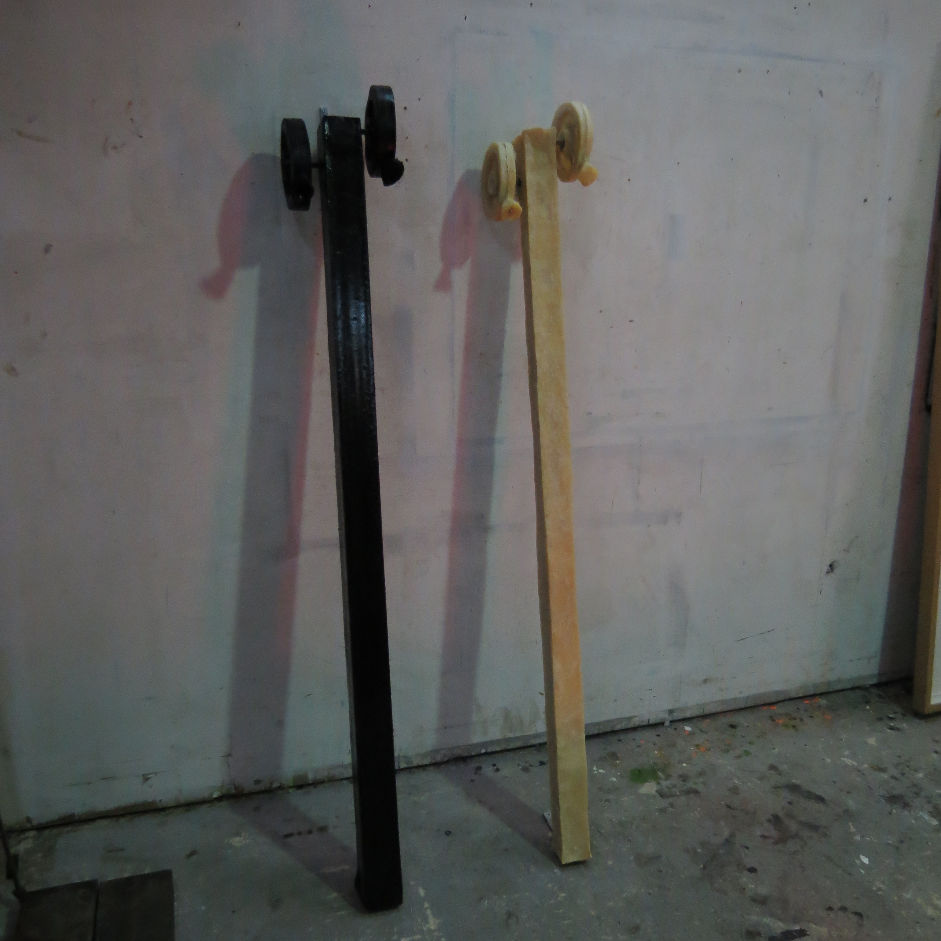 Ces deux formes sont reprises aussi dans deux sculptures en acier et tôle recouvert de bitume, l’une des deux roues tourne dans un bac en zinc recouvert d’eau, un savon de Marseille sert de cale et vient se diluer dans l’eau du bac par le truchement du courant provoqué par la roue.