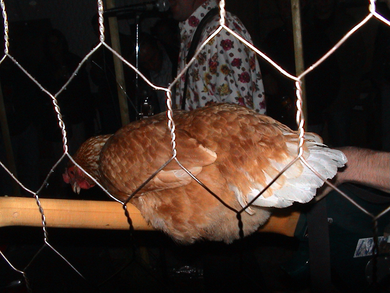 Un concert avec une cage à poule dans laquelle picorent alègrement les cocotes .
