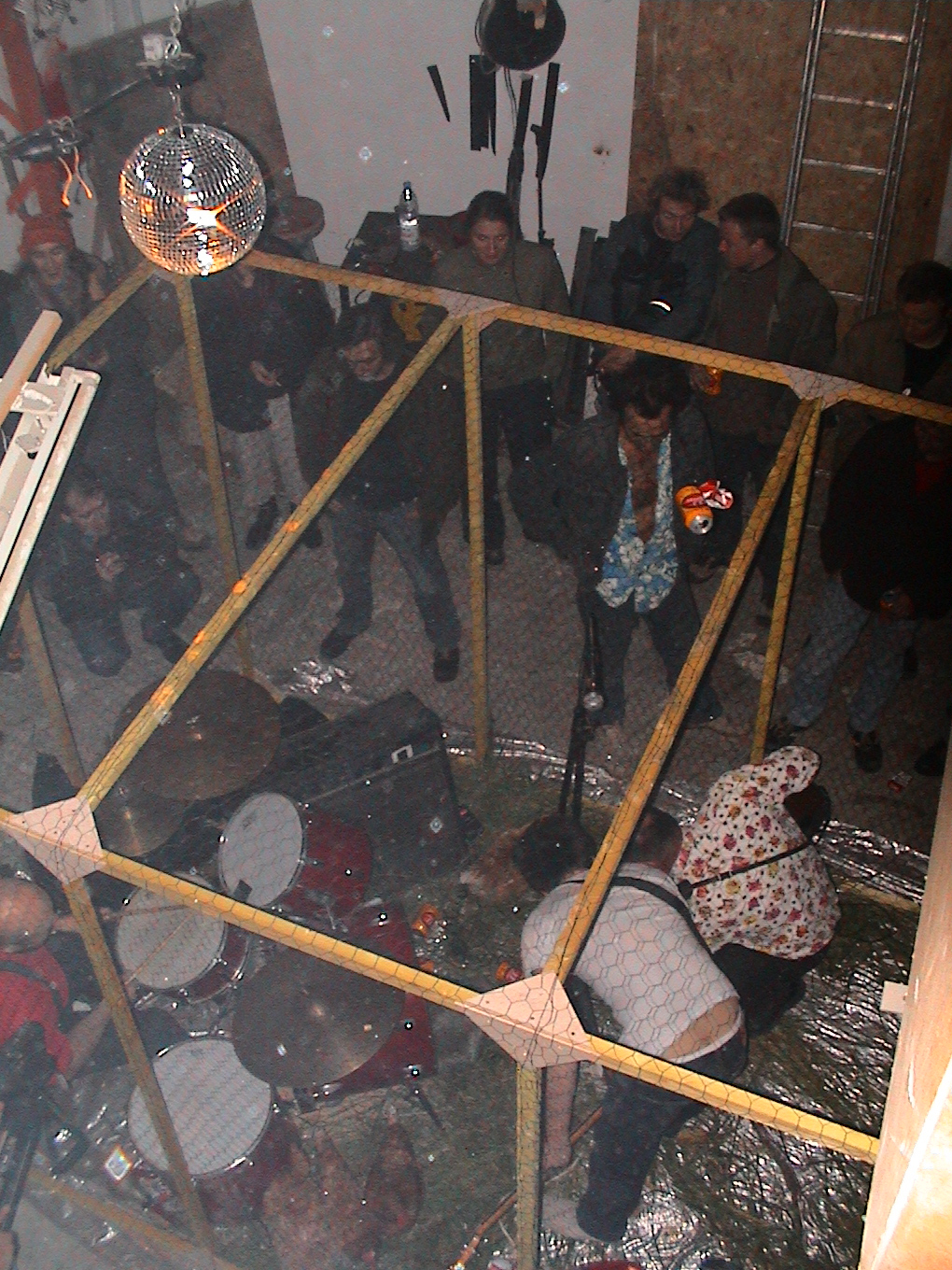 La graine éssemée sur les instruments branchés ; celles-ci fientent et vivent leurs vies de poules durant troix jours, les musiciens entreront dans la cage pour donner un concert mémorable avec les poules.