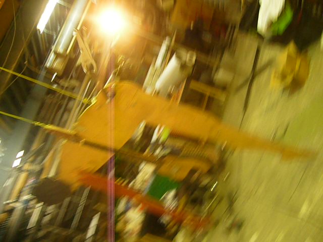 Un moteur d’essuie glasse actionne le pantin dont le bras vient frotter les cordes d’une guitare. Celle-ci est amplifiée ; le son, le larsen le bruit est restitué dans les hauts parleurs et rénvoie au gesticulations chaotiques .