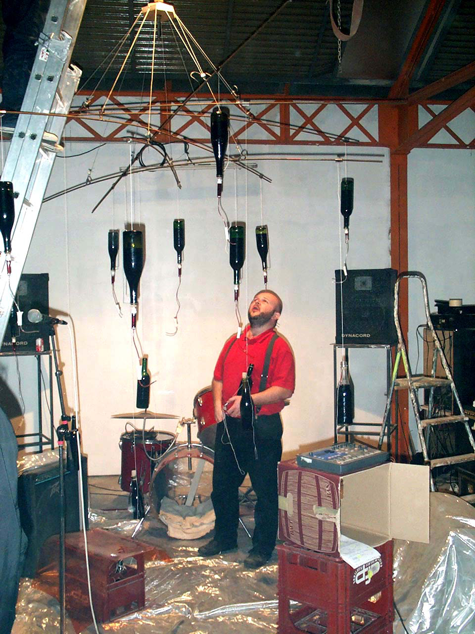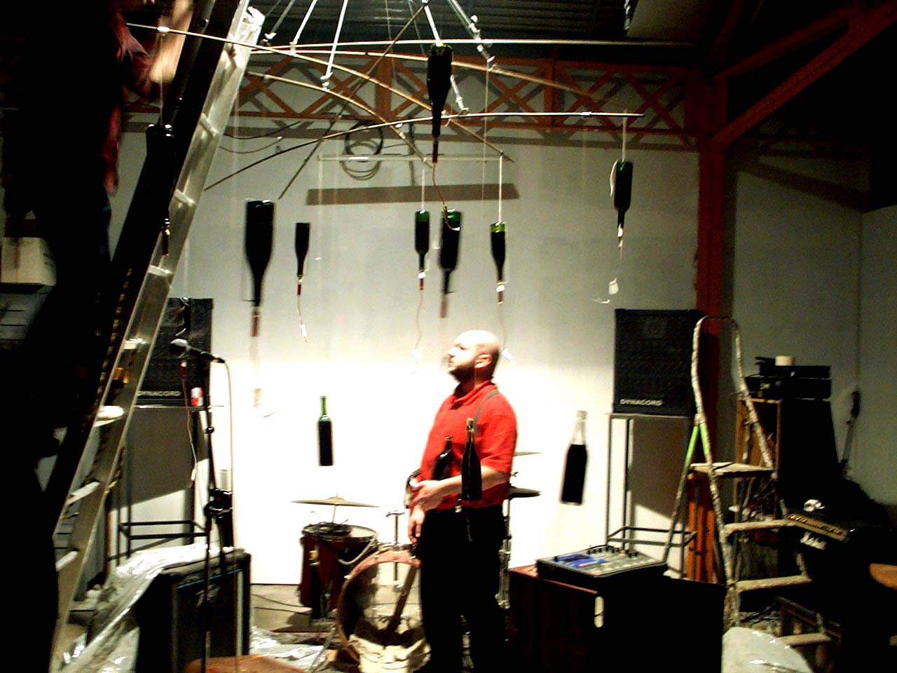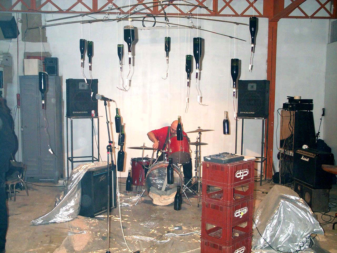 Un mobile composé de 20 boutanches suspendues à l’envers et dans lesquelles sont plantées des goutes à goutes de perfusion. Le postulat est simple s’enivrer avec les efluves de vins et laisser l’ivresse pertuber la musique.