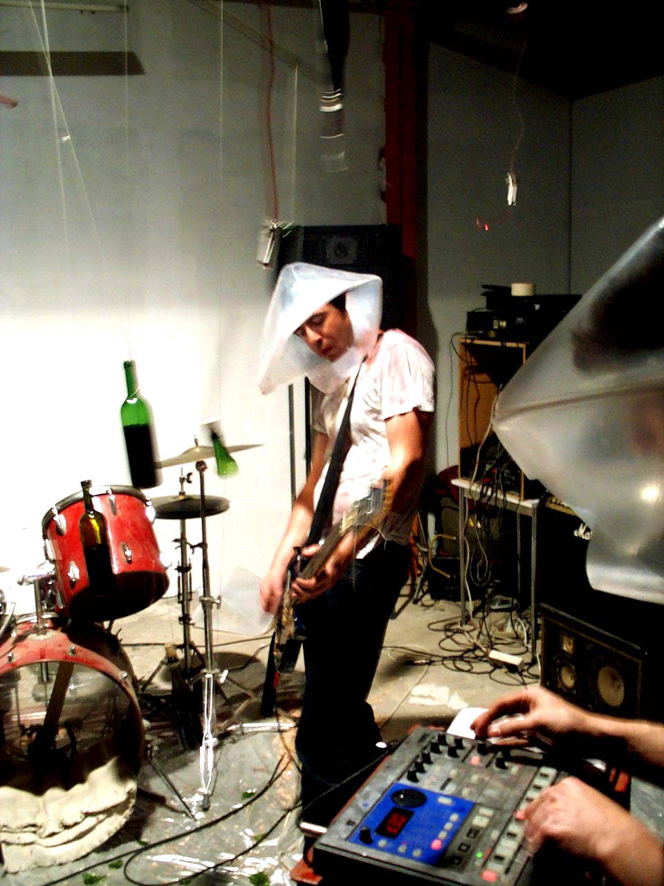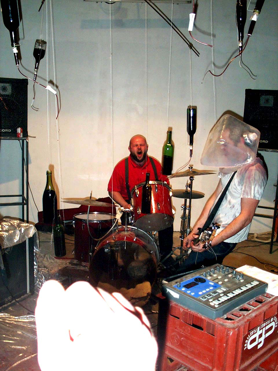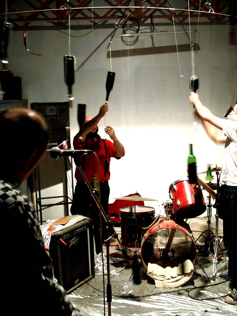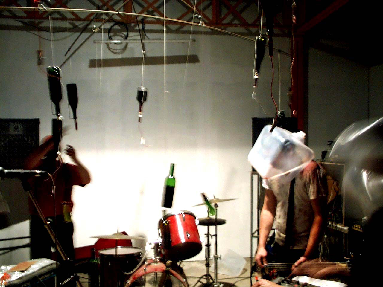 Un mobile composé de 20 boutanches suspendues à l’envers et dans lesquelles sont plantées des goutes à goutes de perfusion. Le postulat est simple s’enivrer avec les efluves de vins et laisser l’ivresse pertuber la musique.
